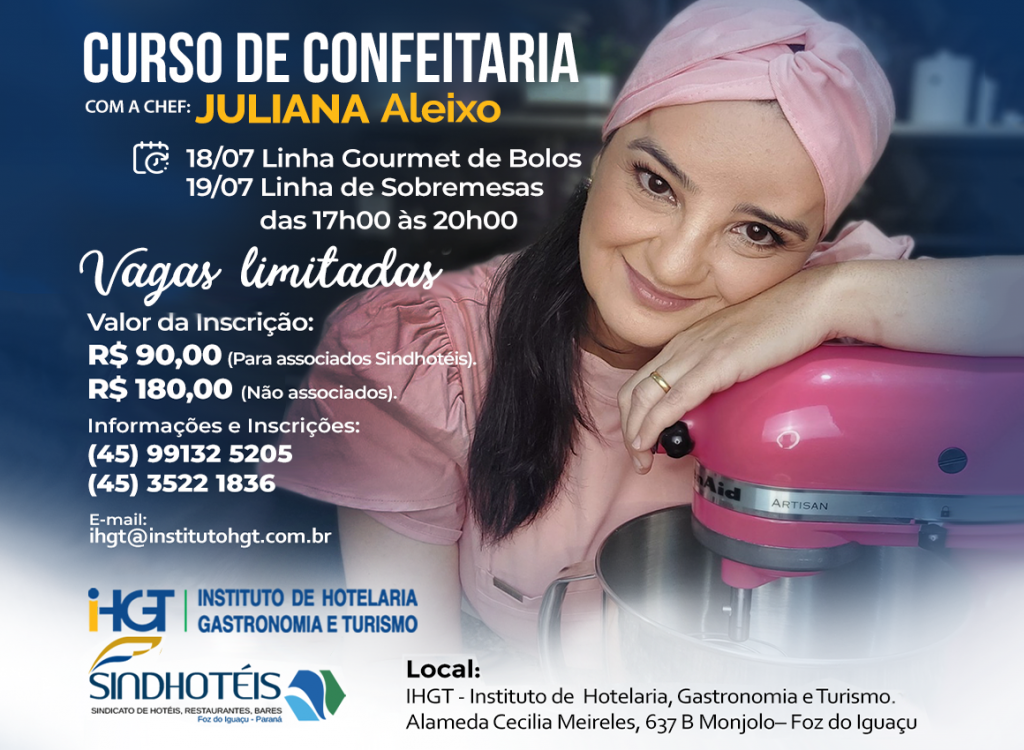 O Instituto de Hotelaria, Gastronomia e Turismo & Sindhotéis, apresentam o curso de confeitaria, com a chef Ju Aleixo, que, irá ensinar delícias da linha gourmet de bolos e sobremesas incríveis! O curso será dividido em dois dias.